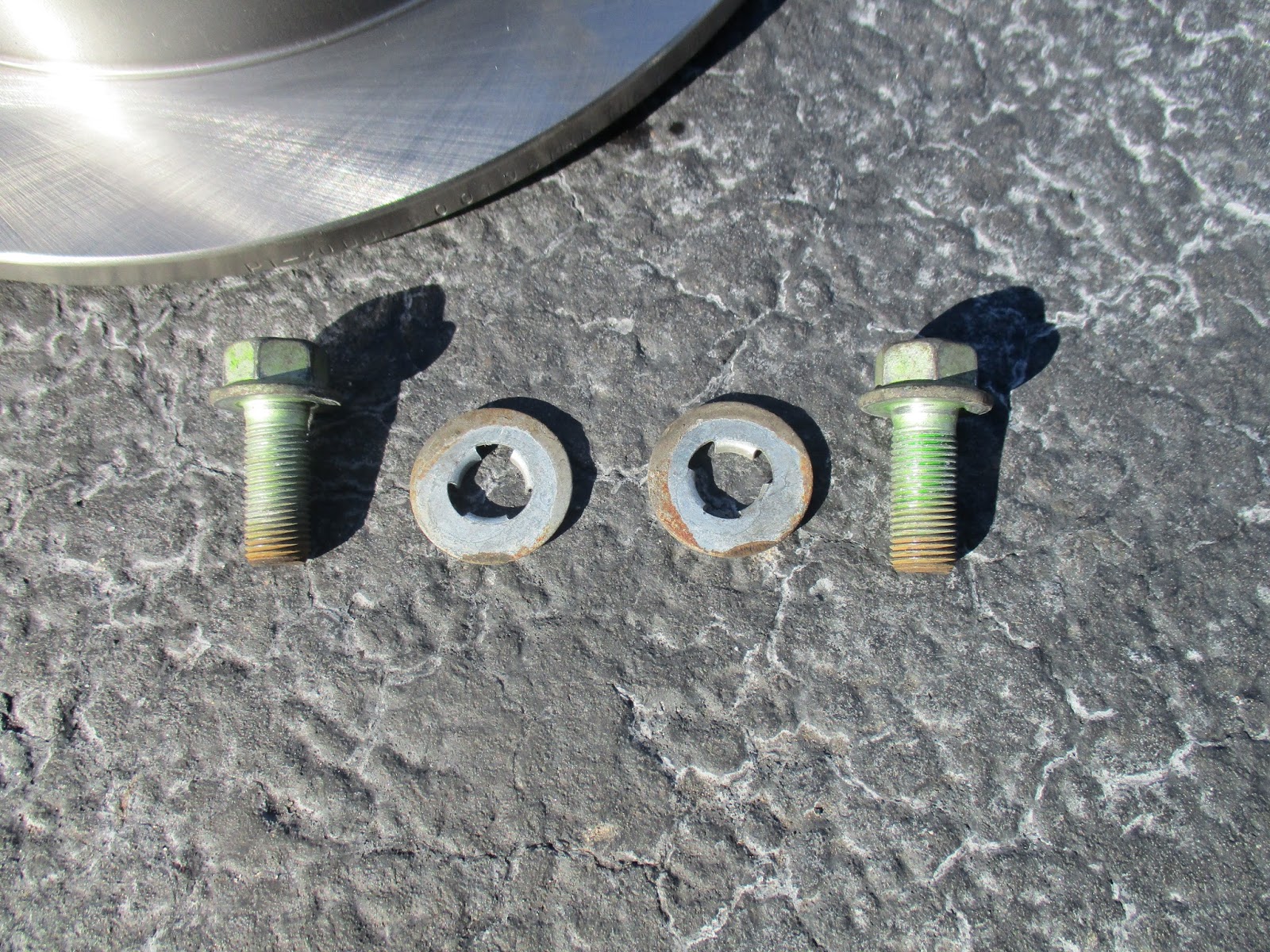 | The two 17mm bolts. Note the funky washers. They went between the caliper cage and the mounting bracket on the car. |