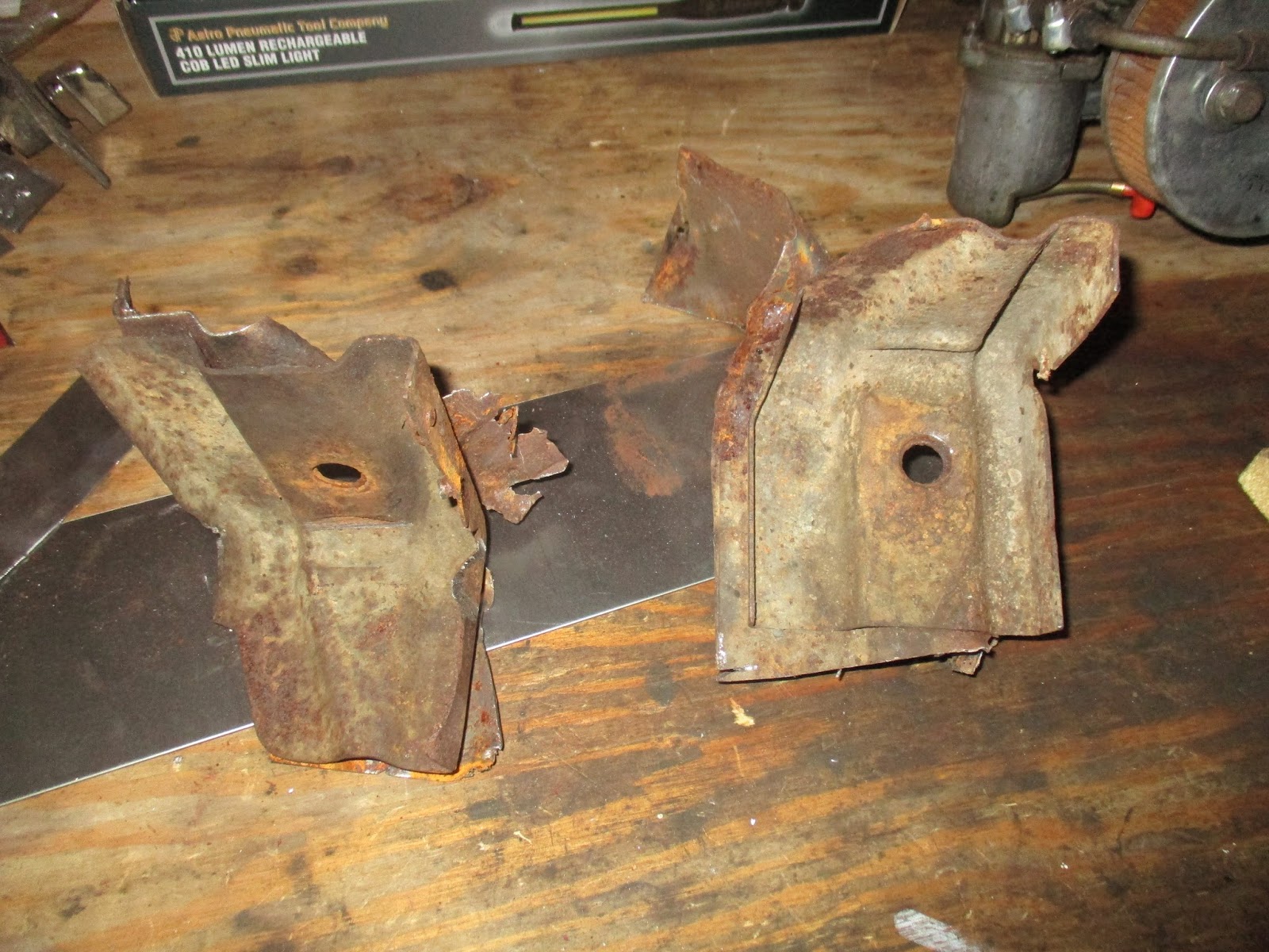 heel board bracket assemblies. These are pretty stout parts as then serve as the transition piece between the body and the radius arms...essentially a body mounted suspension part. While Dot's appear to be okay, there's some rust converter and obvious rust on them. The black car's look to be in better shape overall. I quick trip out back with the Sawzall will make short work of those items, I'm sure.