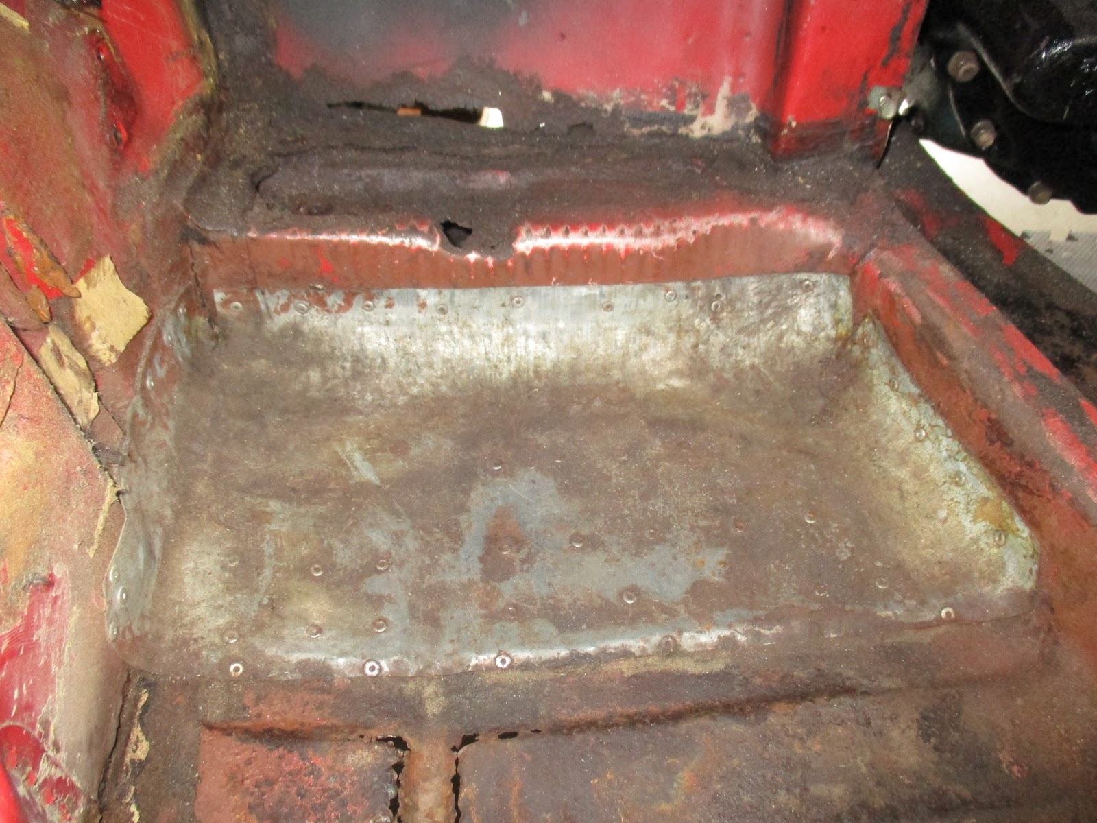 | The swiss cheese of the driver's side floor, after removal of the PO fiberglass patch. Note the pop-riveted sheet metal up front. |