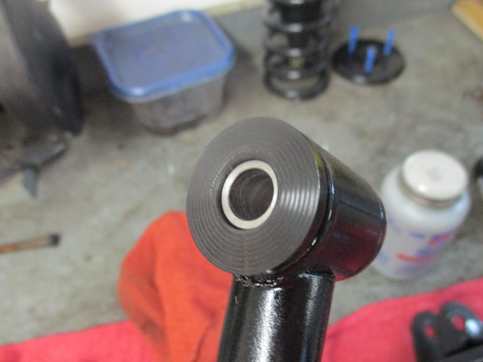 | Bushing sleeve installed. I will be using anti-seize compound (the grey bottle out of focus on the right) to prevent bolts rusting to this. |
