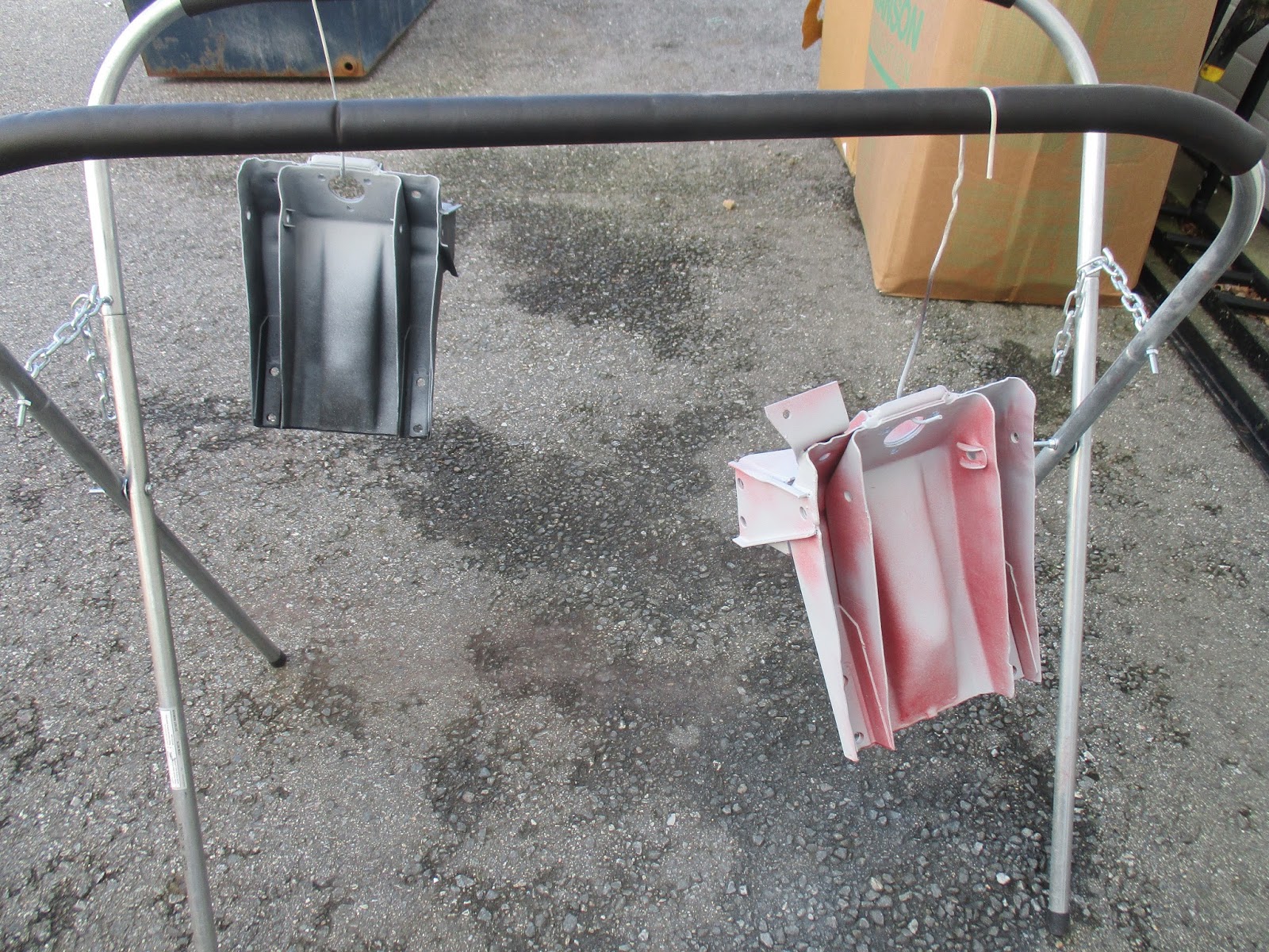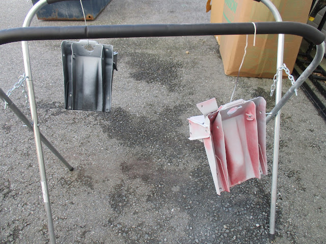 We don't have the gas turned on in the garage yet (propane heat) but the garage warmed up enough after lunchtime on Saturday that I decided to spray the last bit of red that I needed to get on both the frame and the front suspension turrets.