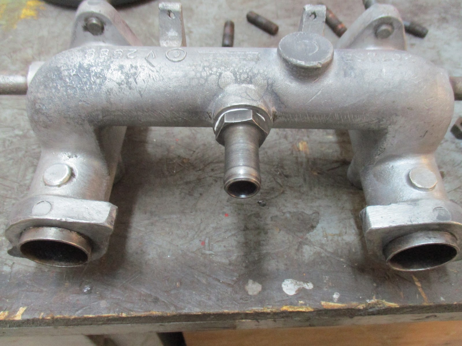 Continuing on, I installed the intake and exhaust manifolds. The intake manifold I cleaned up with a brass wheel brush on a bench grinder and by hand.