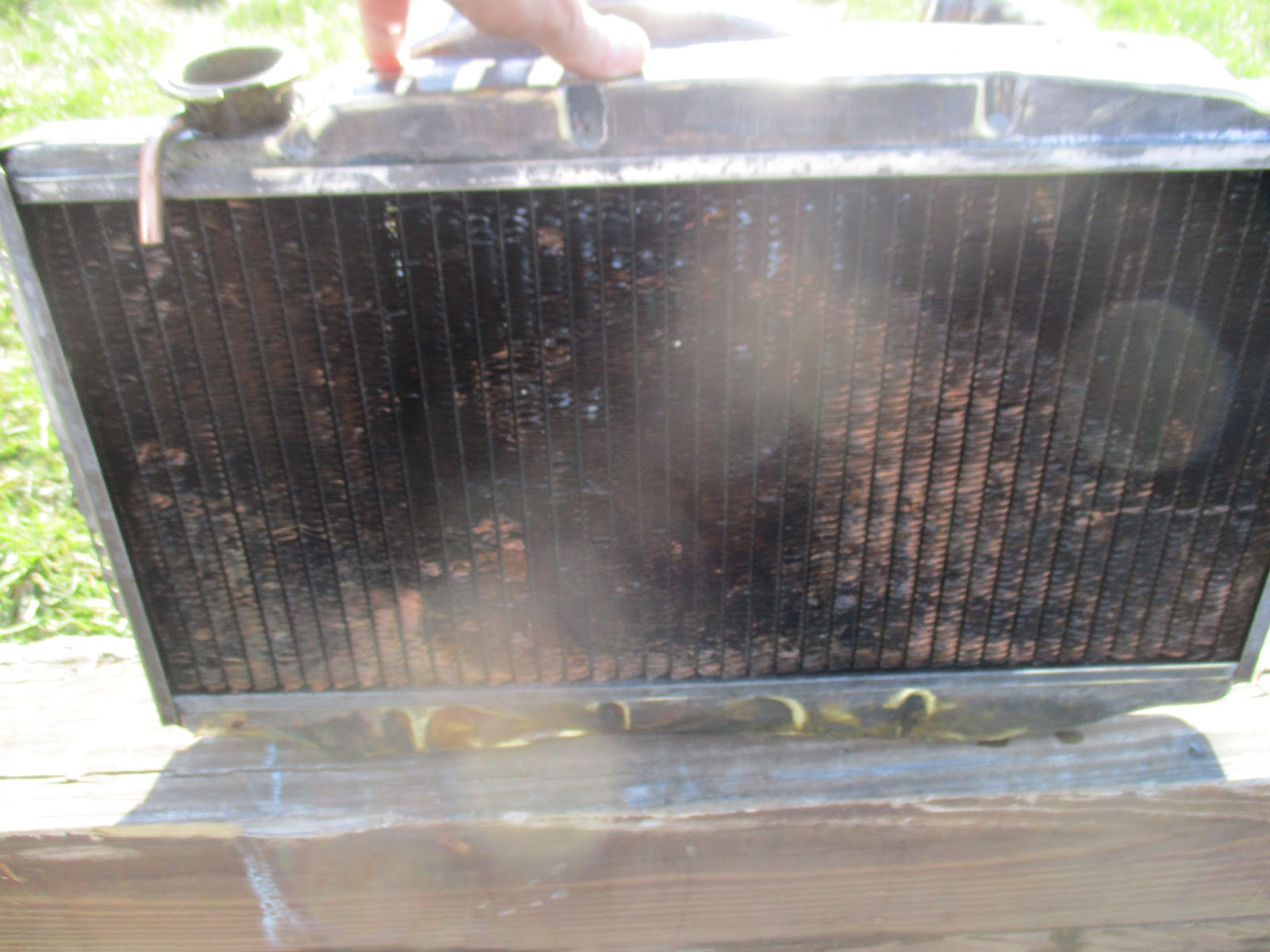 After that, I moved on to cleaning out and sprucing up the radiator. This is one of the items that I got from a guy in Rhode Island getting out of Triumphs. I'm pretty sure I did a post on that, but cannot find it. Anyway, I'm sure there was some rodent living in it for a while because I must have flushed a pound of acorn husks out of it. But, they all came out and the water eventually ran clean. As with other radiators I've seen, this one had obviously met the fan at some point, but not severely enough to rupture any coils. It wasn't until I took a picture of it that I noticed, however.