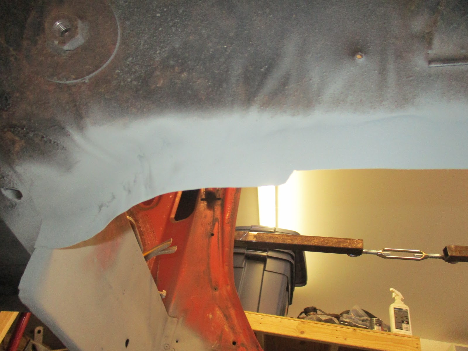 | Welded in and primed. Again, not pretty, but better than it was. |