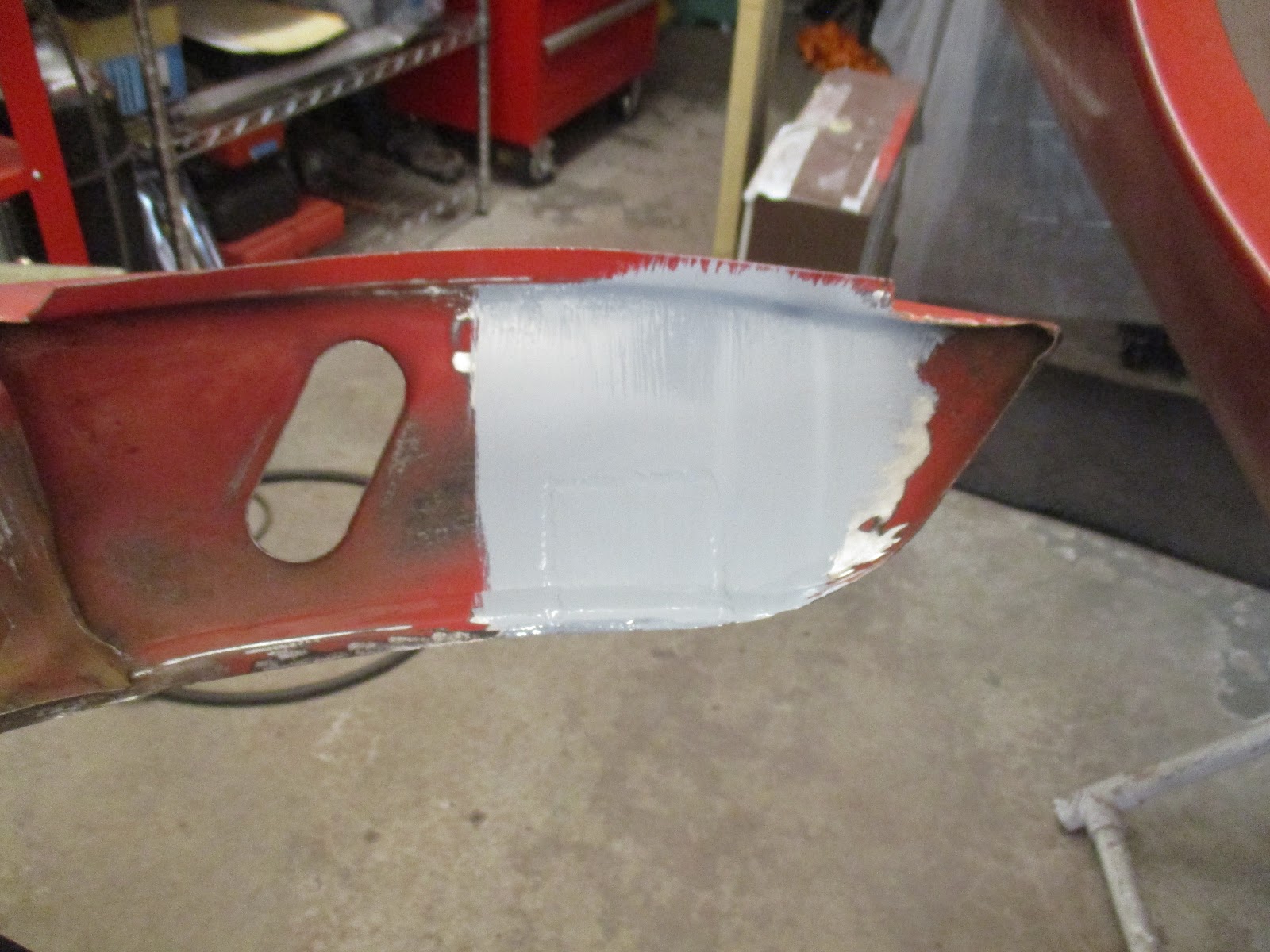 The metal work done, I moved on to getting the strengthener brackets ready to go in. As I've mentioned, I was afraid that using the spray gun I would be unable to adequately get behind them. So, I took a small chip brush and did the backside of the brackets and the area of the front valance that would be hidden by said brackets.