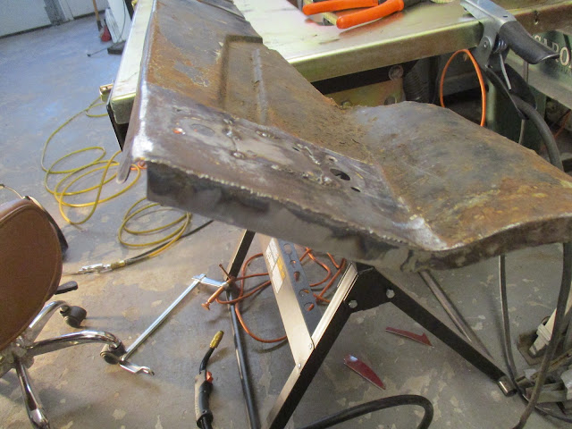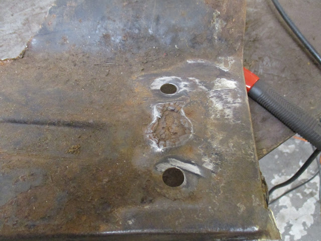 Once I was happy with the fit of the repair patch, I tacked it in on the boot floor side. Next up was to plug weld it in from the strengthener side. At this point, I should have taken care to check the fit, horizontally, to make sure the boot floor was "down" far enough. I was so concerned with the fit of the patch to the floor itself that I didn't care for where it would weld to the strengthener. Due to whatever flex was there, it resulted in me plug welding it in about 1/2" too high (give or take).