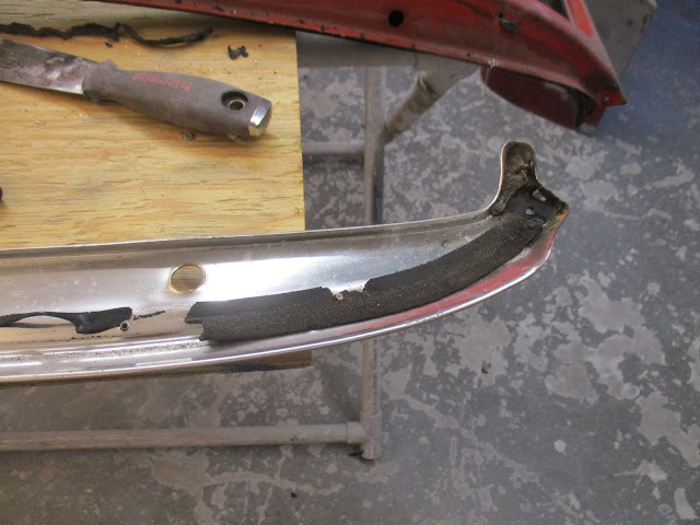 The other thing that needed to come off was the vinyl trim around the inside of the frame. I had worked on this a very little bit when I first got the car, but now it had to come off for epoxy application.