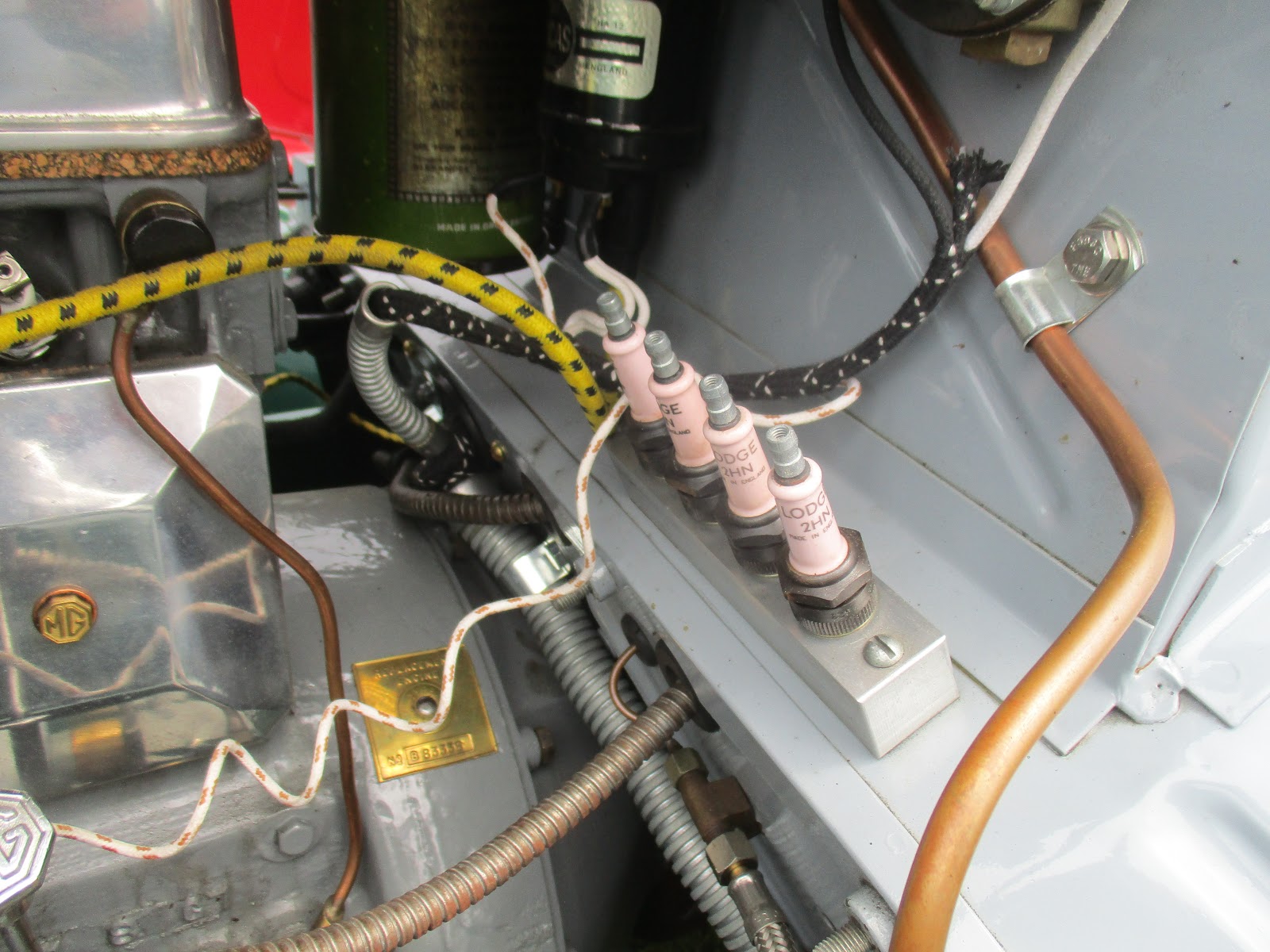 I've run into this before, but again I had the problem of finding a good ground for the welder since the bonnet is covered in paint. Fortunately, the very ends of the tabs were not painted. I had taped them all to a piece of metal so I could handle that vice the little tabs themselves when painting. These provided my bare metal spot and I clamped the ground strap right to them.